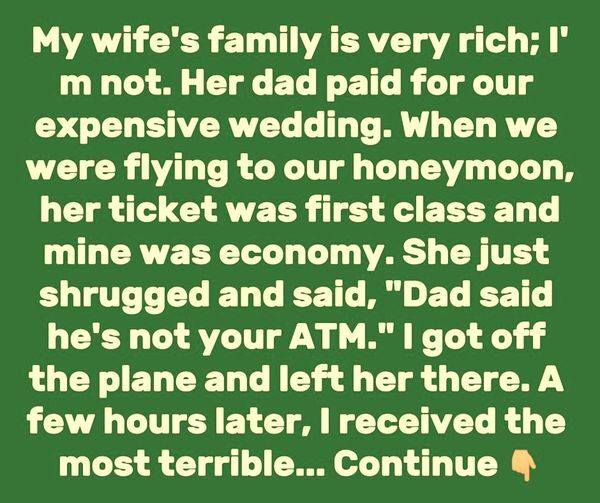 When we got on the plane for our honeymoon, she sat first class, and I realized my ticket was economy.