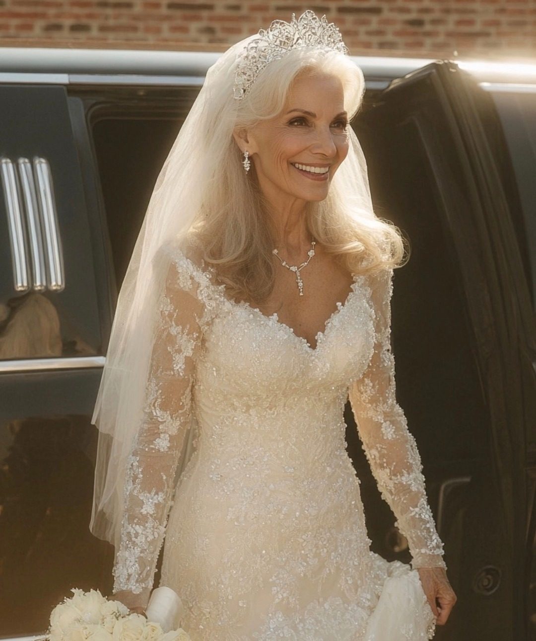 At exactly 2:45 PM, a sleek silver car pulled up. We all held our breath as the door opened. Out stepped Dorothy—taller, bolder, and brighter than anyone had ever seen her. She wore a pure white wedding gown so encrusted with crystals it nearly glowed. On her head sat a huge tiara, and behind her trailed a cathedral-length train that pooled at her feet.