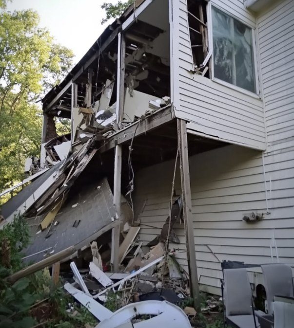 My front door was barely hanging onto the frame, twisted like someone had kicked it hard. One of the windows was shattered, glass glittering on the front steps. The siding of my house had burn marks on it — black smears that made my stomach turn.