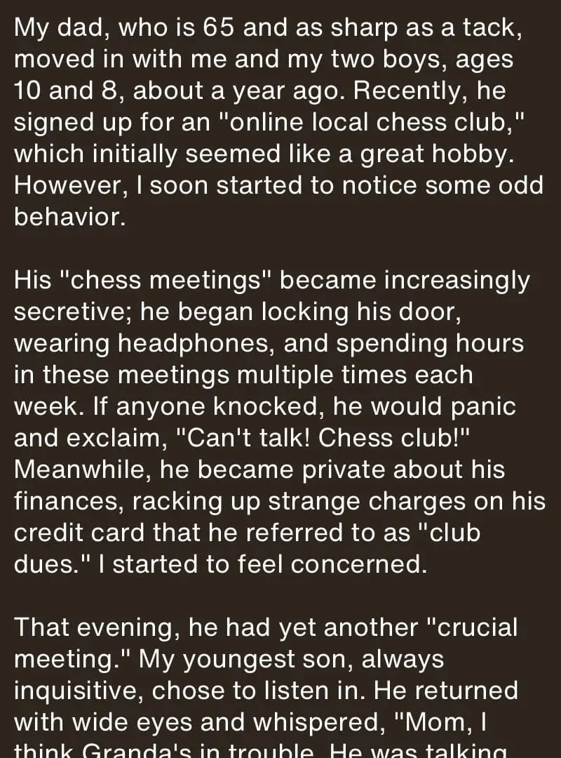 My 65-Year-Old Father Claimed to Join a ‘Chess Club’ – What My Son Overheard During Their Online Session Shocked Me