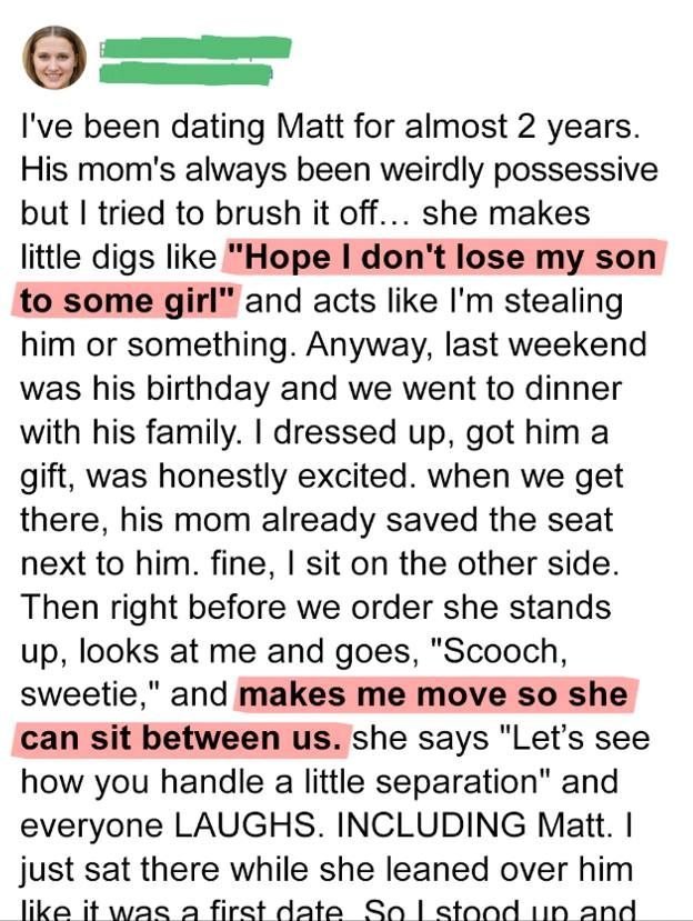 My Boyfriend’s Mom Took My Seat at His Birthday Dinner So She Could Sit Between Us