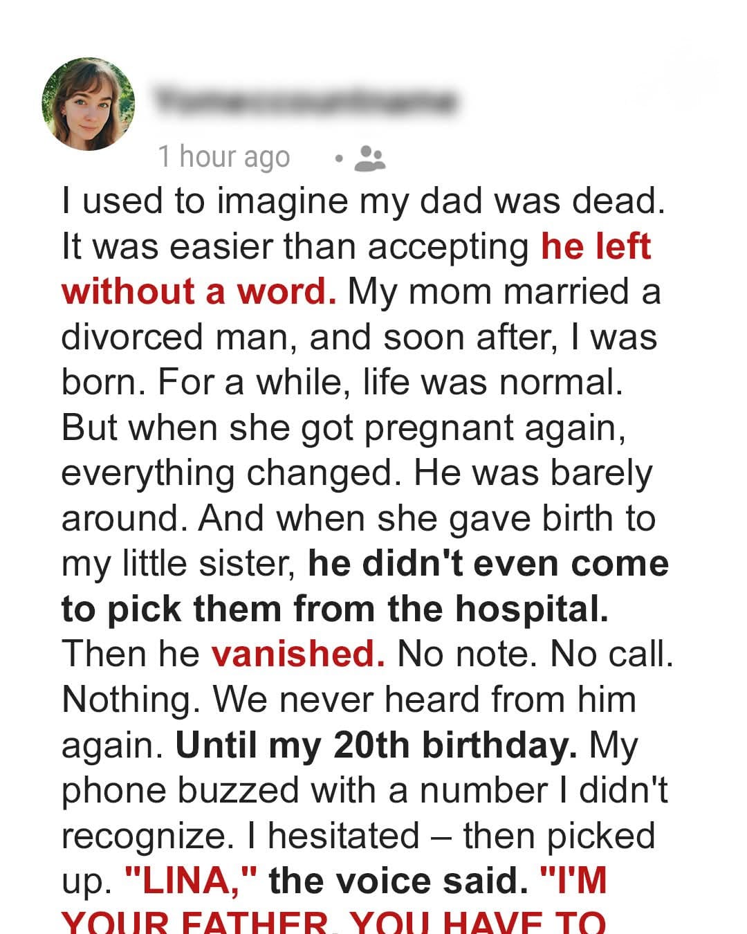 The phone rang on my 20th birthday with a number I didn’t recognize. “Lina,” the voice said. “I’m your father.” After 17 years of silence, my dad wasn’t calling to apologize or reconnect. He wanted something else entirely.