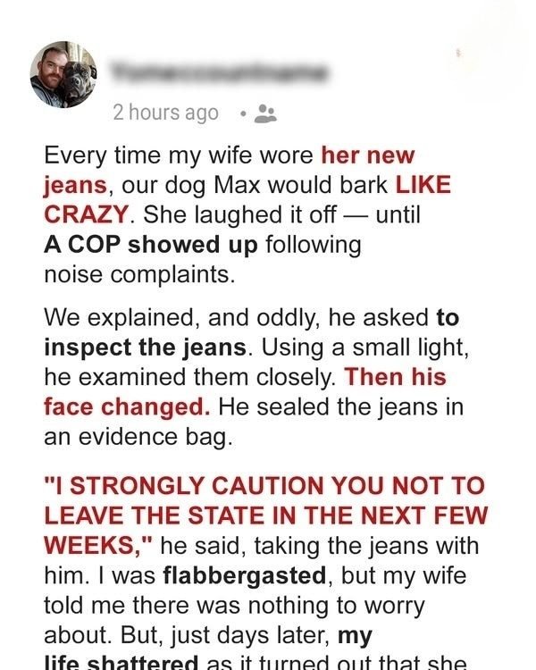 I never thought a pair of jeans could end my marriage. My wife, Evelyn, and I had been married 15 years. After years of struggling with infertility, we brought home a Labrador named Max. He became the heart of our home — loyal, loving, and strangely protective. One day, Evelyn came home wearing new jeans. The moment she walked in, Max went wild — barking, snapping, and circling her. He calmed down only after she changed. At first, we thought it was a fluke. But it happened every single time she wore those jeans.