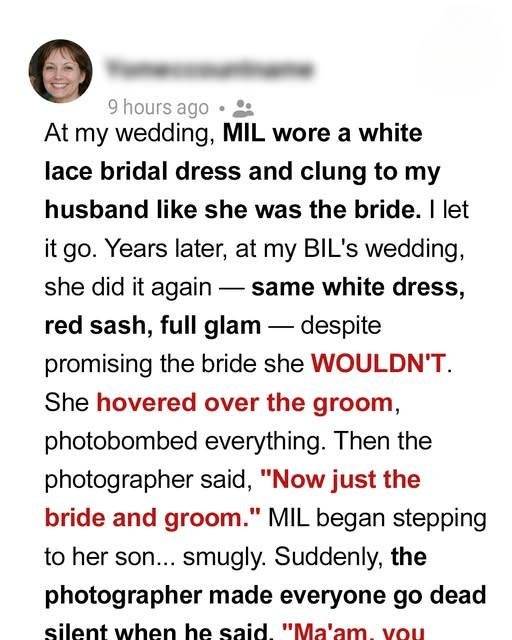 On Dylan’s wedding day, just as the ceremony began, Linda arrived wearing the exact same white dress she wore to my wedding—this time with a red sash, as if that somehow made it different. My heart sank when I saw Sarah’s face fall.At the reception, Linda inserted herself into every photo. When it was time for couple portraits, the photographer calmly said, “Just the bride and groom, please.”