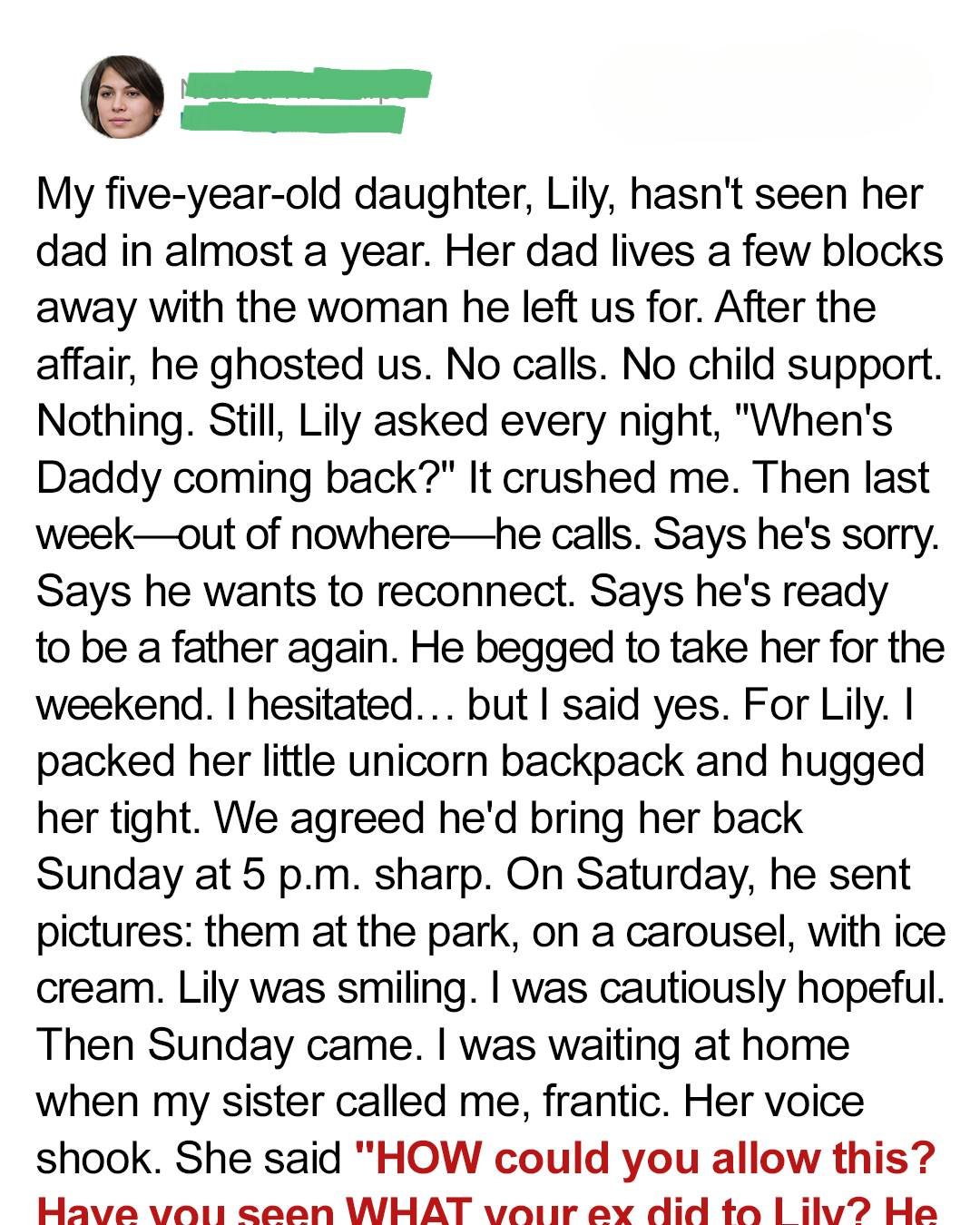 When my ex-husband Leo said he wanted to reconnect with our daughter Lily, I thought he was finally ready to be the father she deserved. I packed her little backpack with pajamas, snacks, her favorite teddy bear, and a dress she loved, hoping for a happy weekend together. After three years of absence, I wanted her to feel his love, and I tried to trust him.