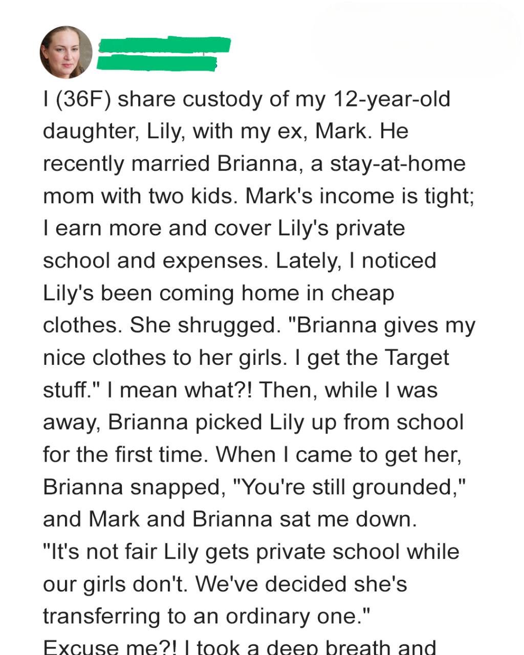“And,” I stepped closer to Brianna and looked her in the eye, “if you steal Lily’s clothes, or anything else, again, or mess with her education, I’ll see you in court.”