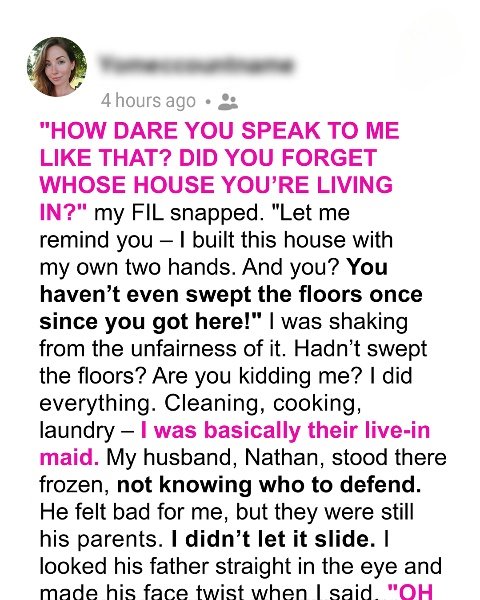 When my father-in-law lost his temper over a spilled mop bucket and said, “Did you forget whose house you’re living in?” I was stunned. For a year, I had cooked, cleaned, and kept the peace, all while Nathan promised we’d move “soon.” Living in his parents’ house felt less like a temporary arrangement and more like being an unpaid guest, constantly judged for how I loaded the dishwasher or folded towels.