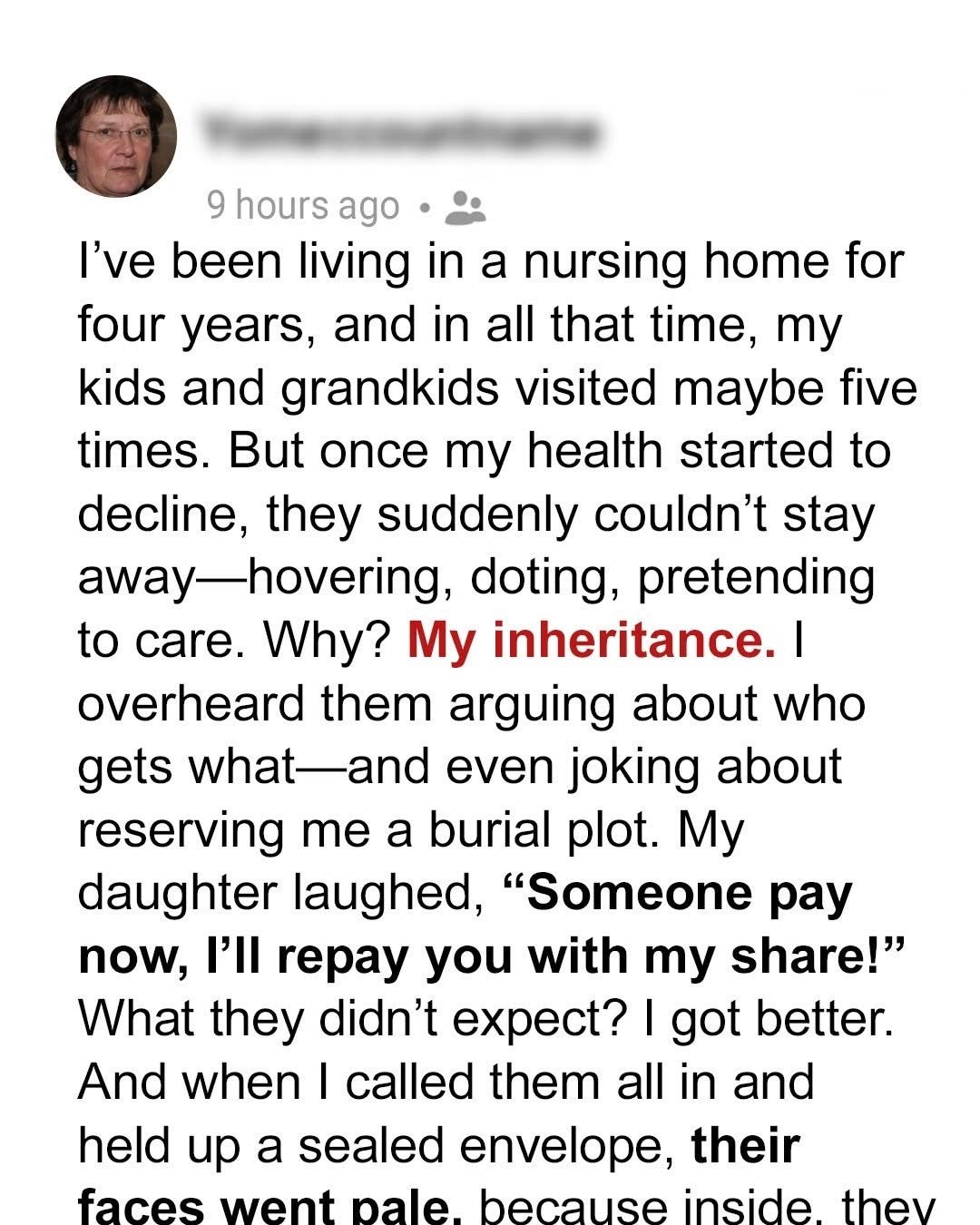 We weren’t rich, but we gave them love, security, and a home. I thought that counted for something. After Harold passed, they put me in a nursing home.