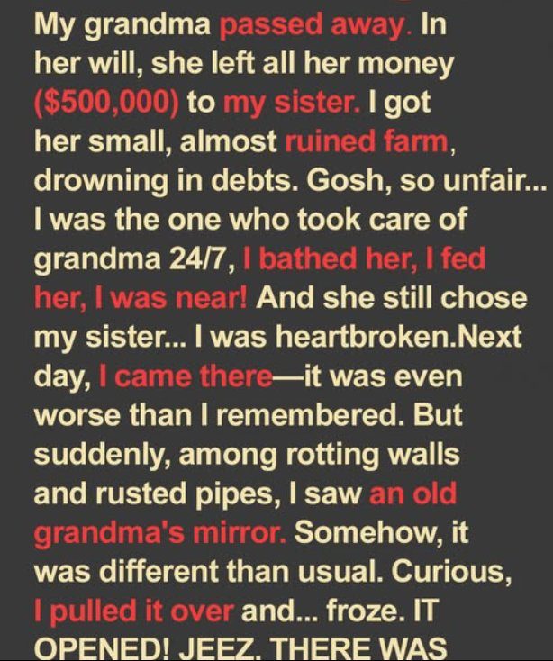 At the will reading, my sister got $500,000 in cash. I got Grandma’s old, crumbling farmhouse—“with all its contents and responsibilities.” But it wasn’t until I opened the closet and found the mirror with a hidden handle that I realized what she’d really left me.