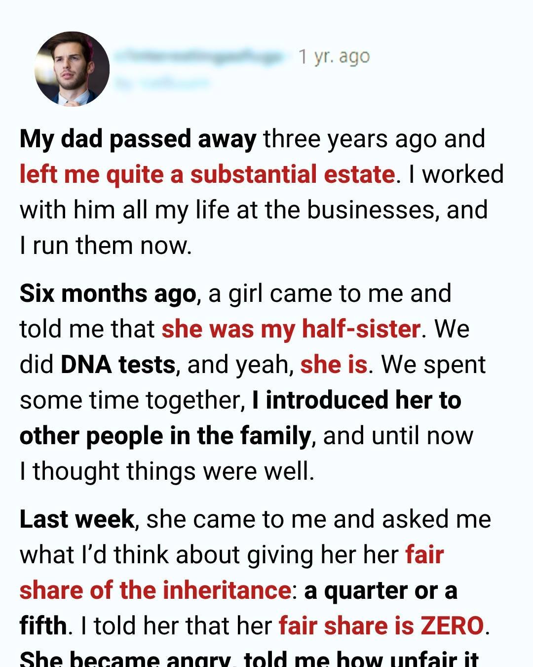 Then, about six months ago, a woman showed up at my office. She looked nervous but determined. She told me she was my half-sister.