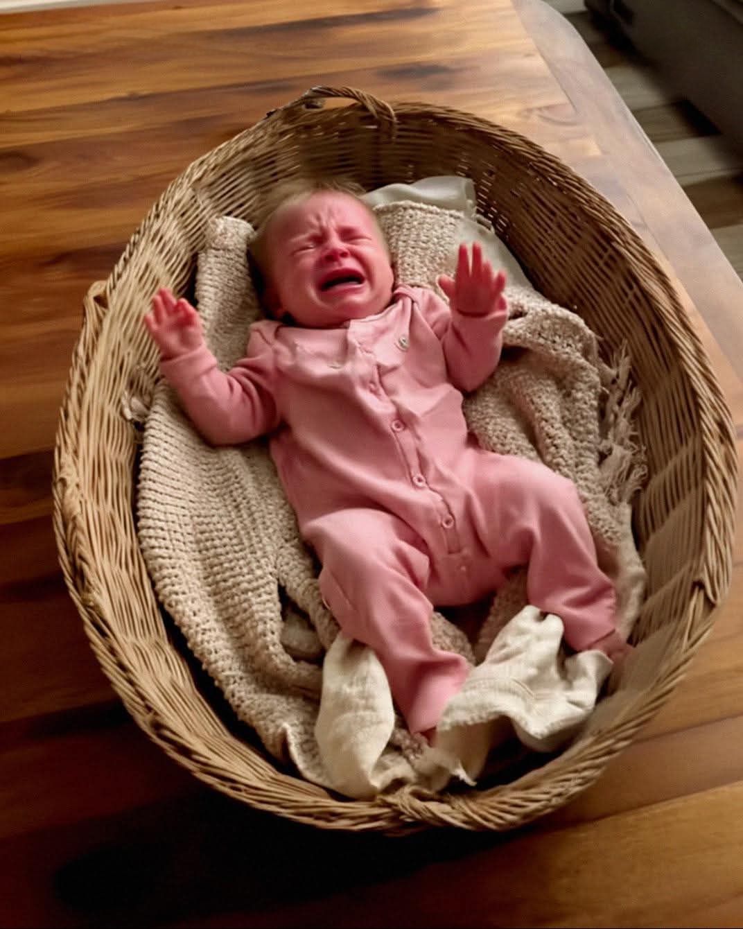 She was dressed in a soft pink onesie, her little fists waving in the air as she cried. A knitted blanket I didn’t recognize was draped around her, slipping loose as she squirmed.