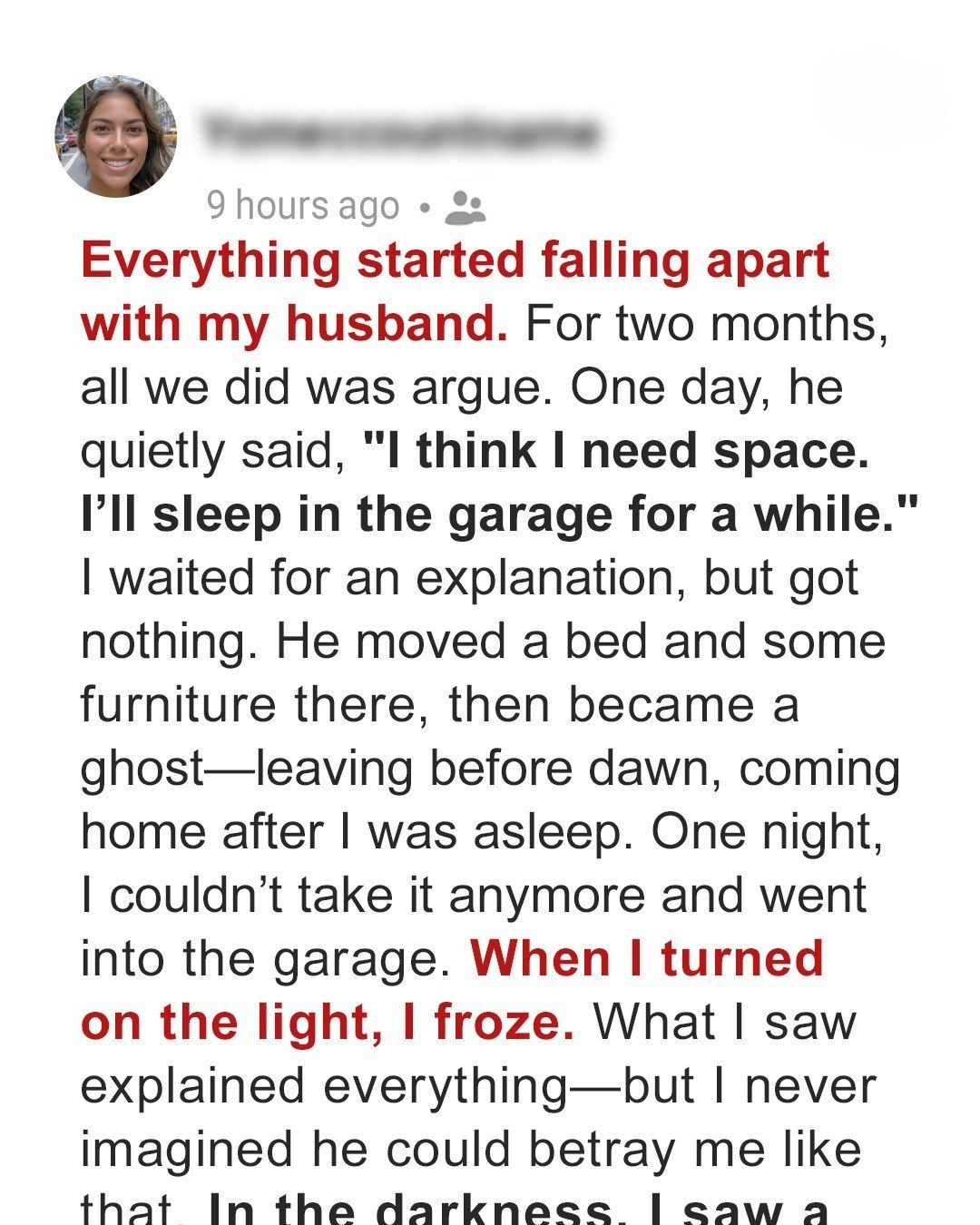 He moved into the garage after an argument that ended with him calling me “clingy” and slamming the door like punctuation. At first, I thought he just needed space. Then I started noticing the signs.