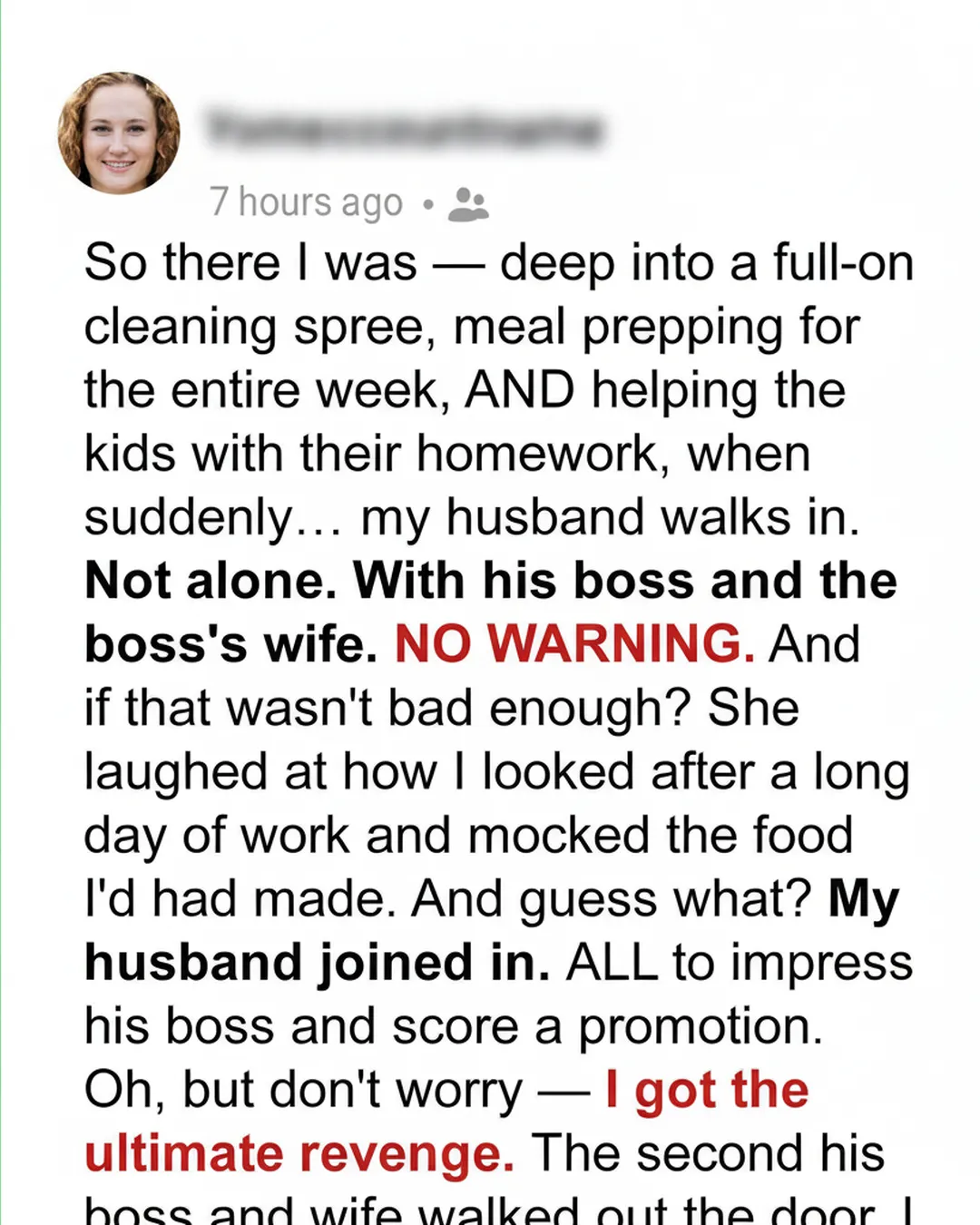 When my husband came home unexpectedly with his boss and his wife, I was completely caught off guard. Still in my cleaning clothes, I felt unprepared but tried to stay polite. The elegant guests exchanged polite smiles that carried a hint of judgment.
