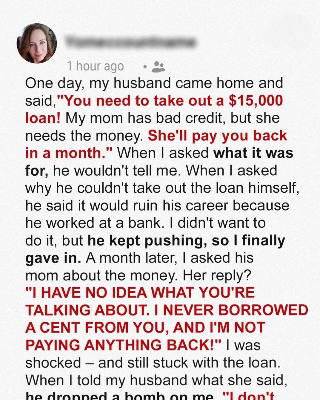 When my husband begged me to take out a $15K loan for his mother, he claimed she’d pay it back in a month. But weeks later, my MIL denied ever borrowing a dime. Now the debt is mine, and the lies are only just beginning to unravel.