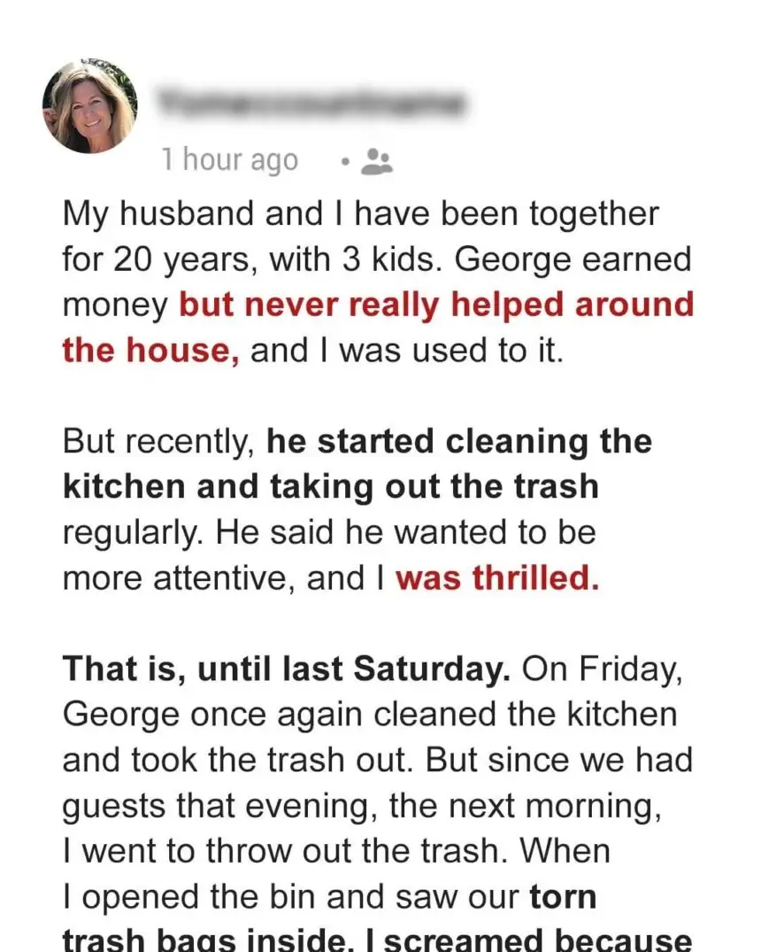 George cleaning our home wasn’t about him being mindful or thoughtful of me. Oh no. This was all about George covering his own tracks.