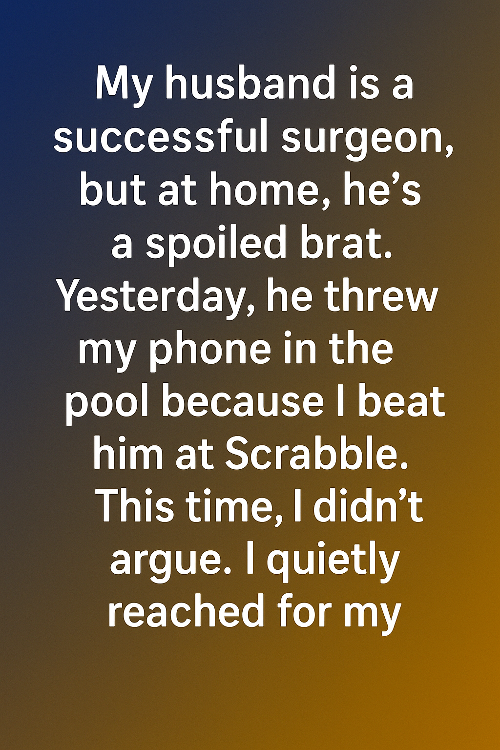 My husband is a surgeon, successful but at home, he’s a spoiled brat. Yesterday, he threw my phone in the pool because I beat him at Scrabble. This time, I didn’t argue.
