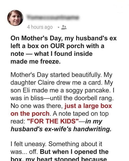 On Mother’s Day, I found a box on our porch labeled “For the kids.” Curious, I brought it inside, but unease settled in my chest. I love being a mom—after three miscarriages, motherhood felt like a miracle. My children, Claire and Eli, were the center of my universe, their laughter and small victories filling our home with joy.