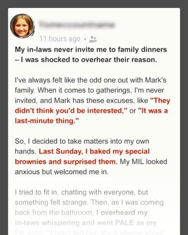 Ever since marrying Mark, I’ve felt like a stranger to his family. His parents, the Harrisons, hold regular family dinners that I’m seldom invited to.