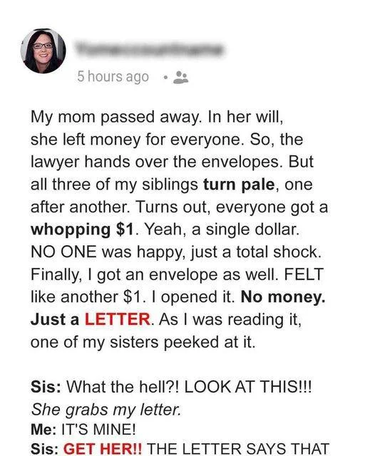 Their mother’s decision to leave everything to Gabby was a heartfelt thank you, a recognition of the love and dedication she had shown. The one-dollar bills that Maya, Tasmin, and Robert received were a painful reminder of the time they had neglected to spend with their mom while she was still alive. As Gabby held the letter in her hands, a mix of emotions overwhelmed her – gratitude for her mother’s love and appreciation for her siblings.