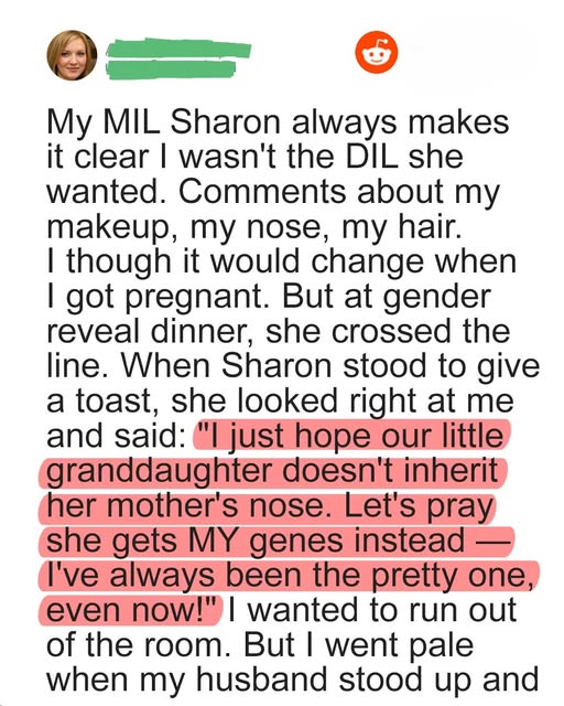 Then she raised her glass and said, loudly, with a smile: “I just hope our little granddaughter doesn’t inherit her mother’s nose. Let’s pray she gets MY genes instead — I’ve always been the pretty one, even now!”