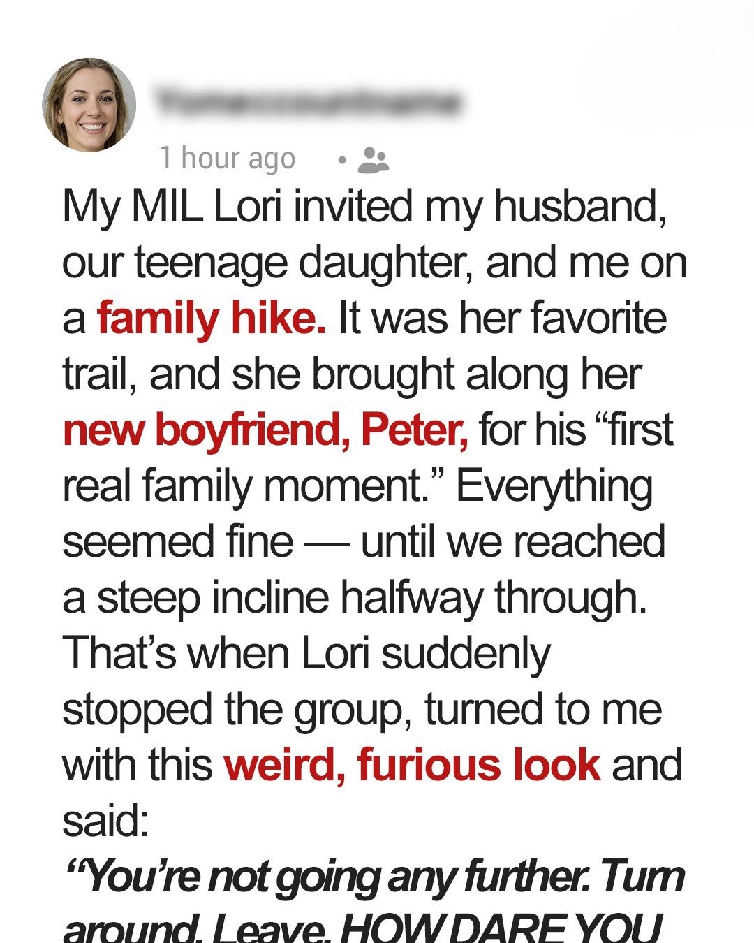 It was supposed to be a peaceful hike — just our family and my mother-in-law, Lori. But instead, it became the moment I was humiliated. Lori had invited us to introduce her new boyfriend, Peter.