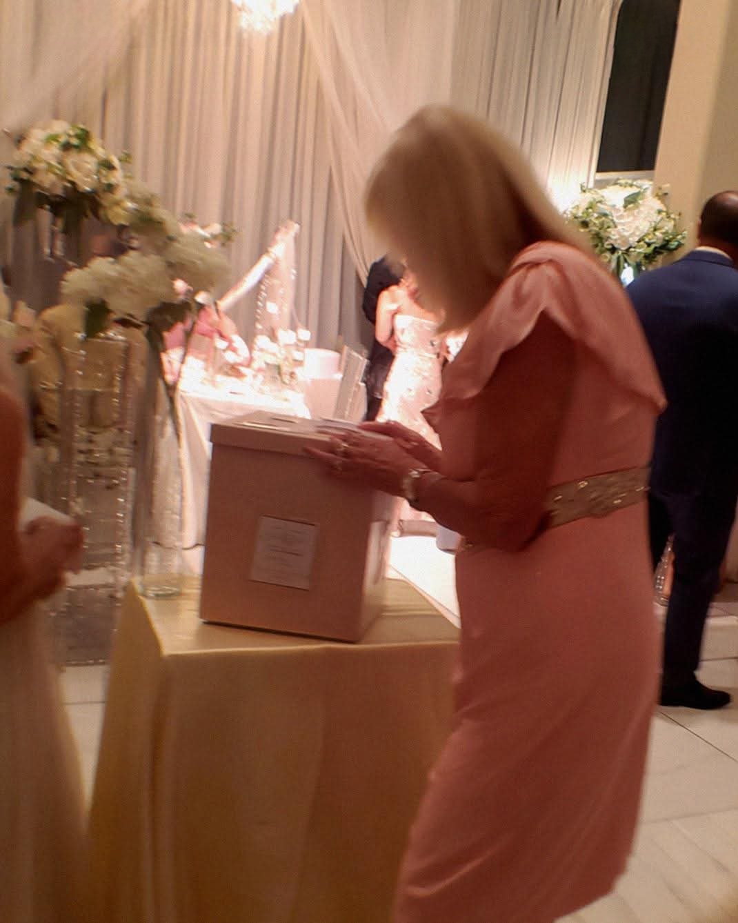 After a few dances and the cake was cut, I went to the gift table. The table was still there, candles flickering, the little sign in place, but the card box was gone.
