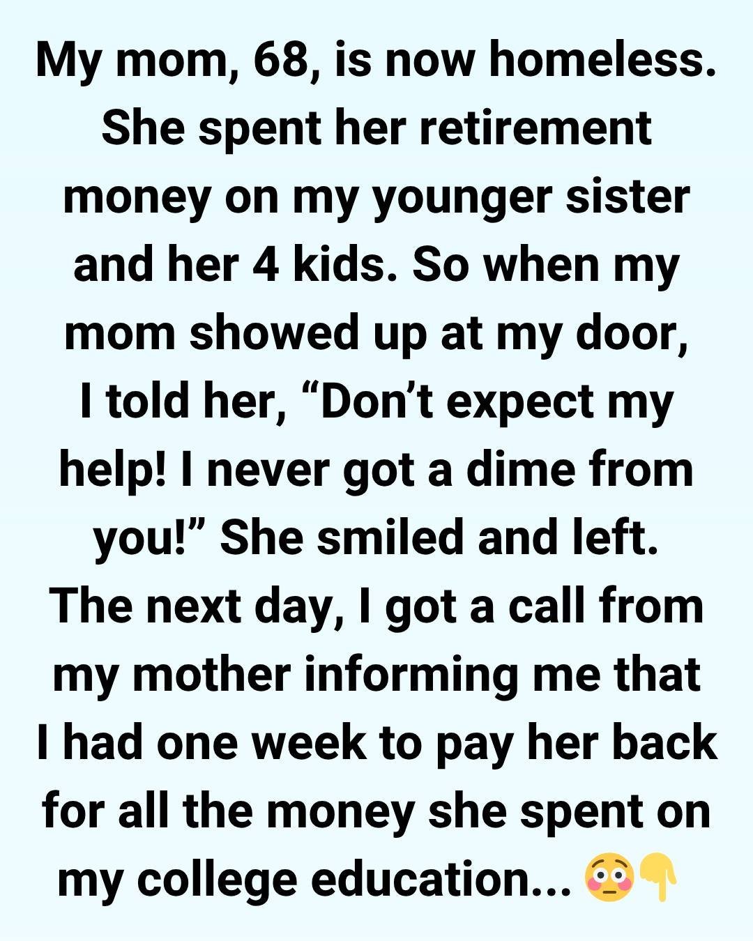 Since graduating, I’ve supported myself completely, while my sister used up all of my mom’s retirement savings. So, is it really fair for me to pay my mother back? Source: brightside.me