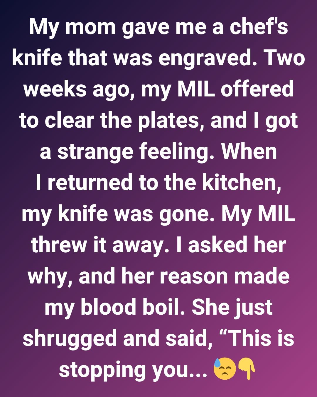 When I was done cooking, I left the knife on the counter to wash later. After dinner, my MIL offered to clear the plates, which wasn’t unusual, but this time I got a strange feeling. It was like something was trying to warn me about her.