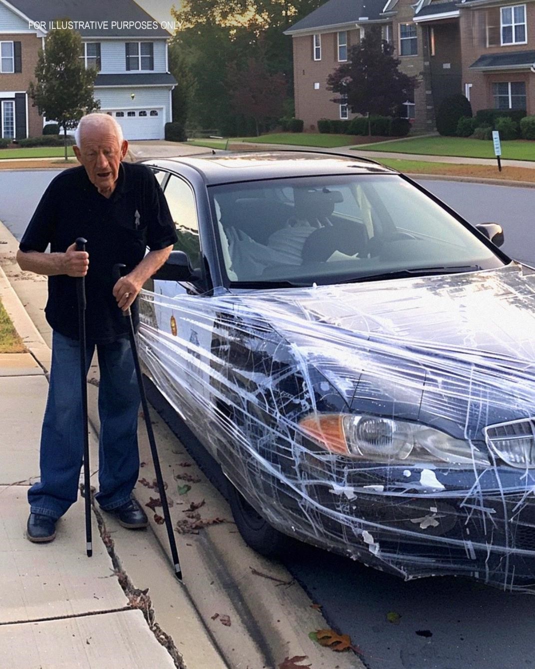 The next morning, I woke up to a nightmare. My car was completely wrapped in tape.