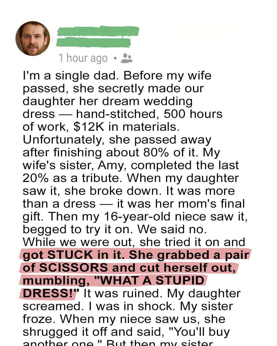 My late wife, Linda, spent nearly 500 hours hand-sewing a wedding dress for our daughter, Sammy. It cost $12,000 and was her final act of love before passing away from cancer. The dress was almost finished when Linda passed, and her sister, Amy, lovingly completed it.