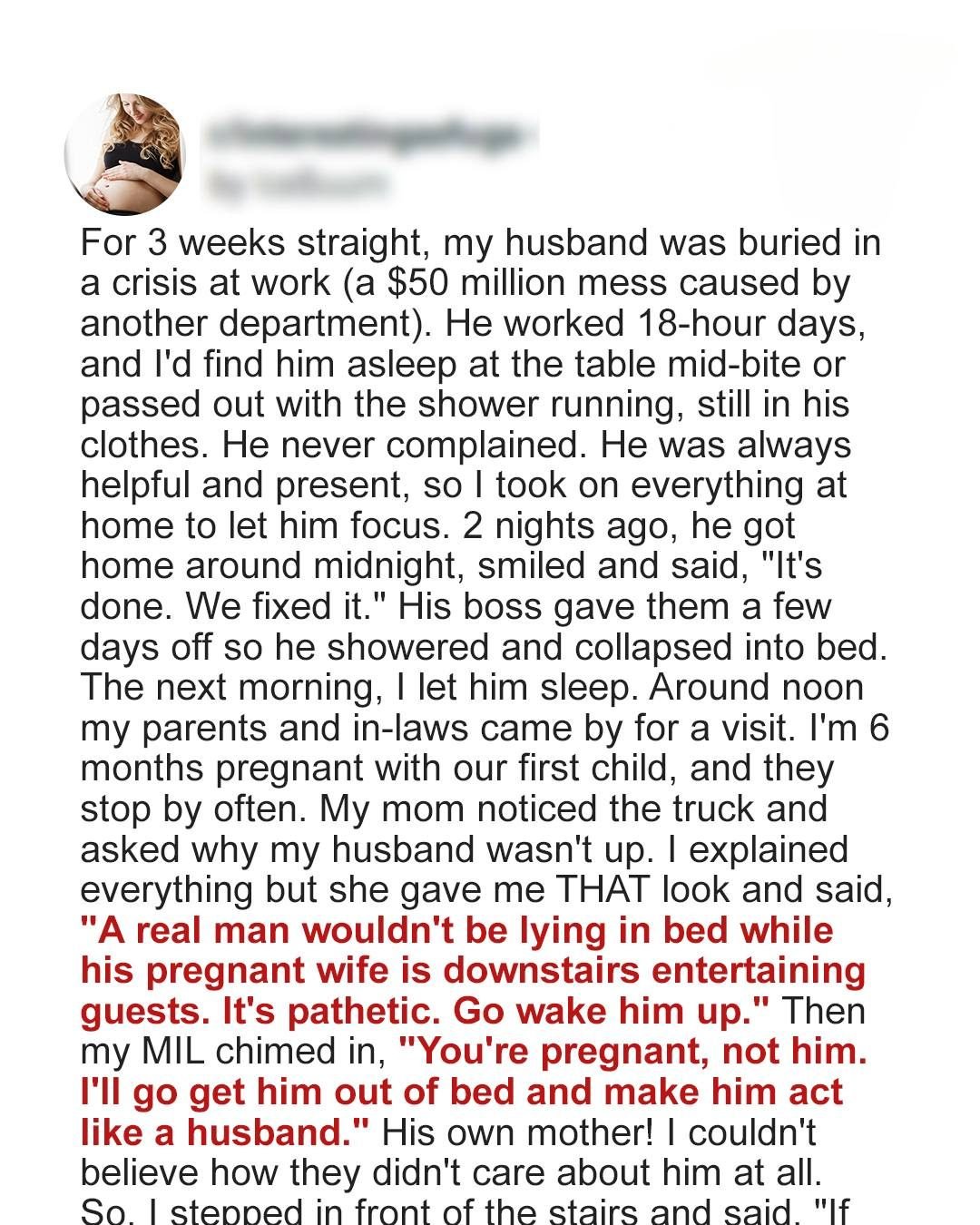 When I said he was still asleep, judgment filled the room. My mother frowned. “He should be up helping you.” My mother-in-law added sharply, “A real man wouldn’t be lying in bed while his pregnant wife entertains guests.” When she tried to go wake him, I blocked her path. “No. You won’t,” I said firmly. “Marcus has been supporting me every day. Now I’m supporting him by letting him rest.