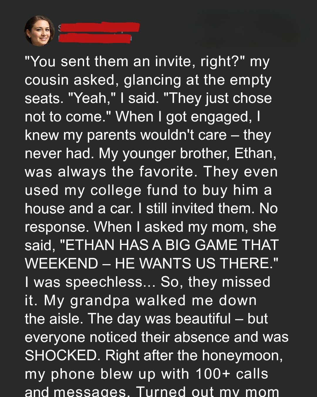 On my wedding day, two seats at the front remained empty — my parents’ seats. For years, they’d favored my brother Ethan, the star athlete, while I quietly accepted being second best. I hoped my wedding would finally bring us together, but a month before the big day, my mom casually told me they wouldn’t attend because Ethan had an important game.