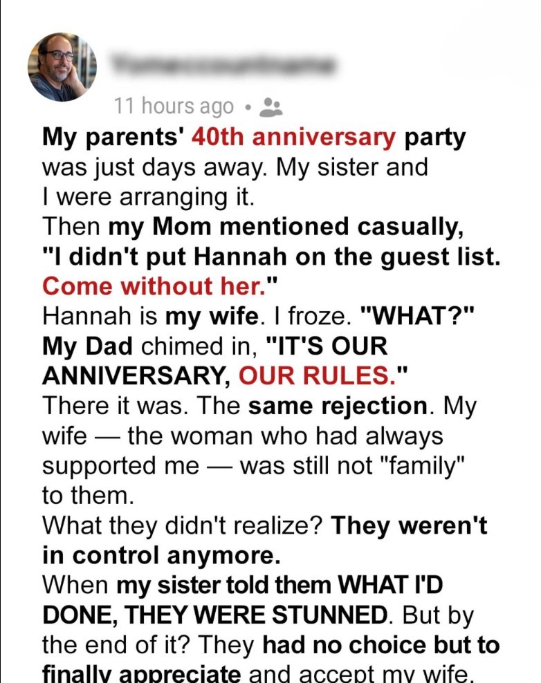 For years, my parents ignored my wife and pretended she didn’t exist. They pushed her aside from every gathering and invitation. But when they told me she wasn’t welcome at their anniversary party, I decided enough was enough. It was time they learned exactly what it felt like to be left out.