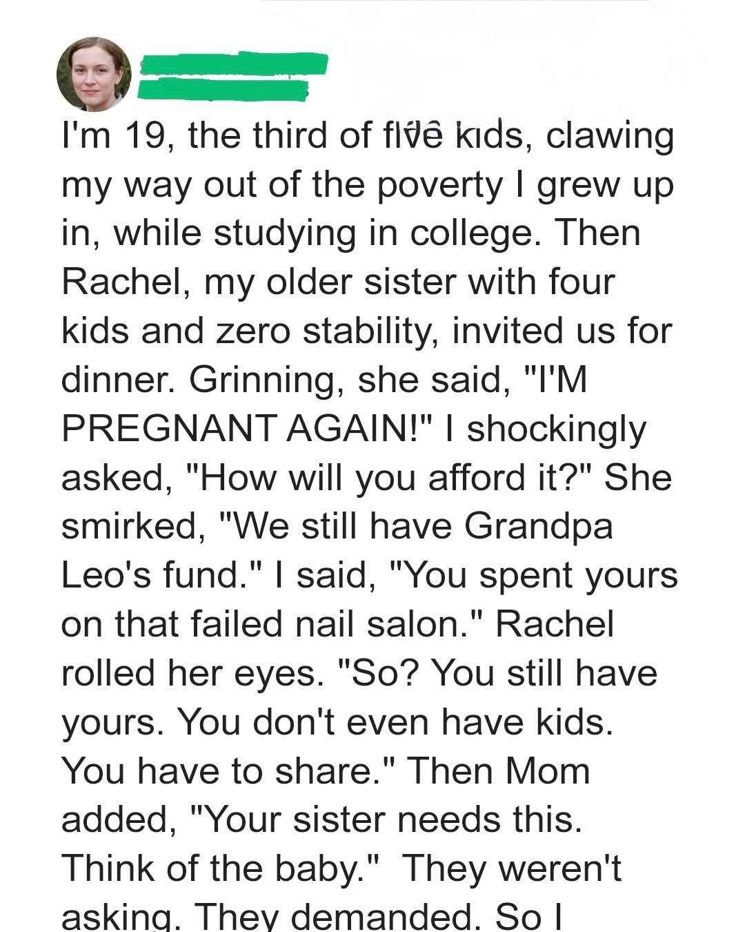 When my pregnant sister demanded I hand over my college fund for her fifth baby, I finally understood what it meant to choose myself over family expectations. I’m the third of five kids, raised in poverty, surviving on hand-me-downs and charity. At 19, I’m fighting to escape through education, working 20 hours a week, living on ramen, and stretching every penny.