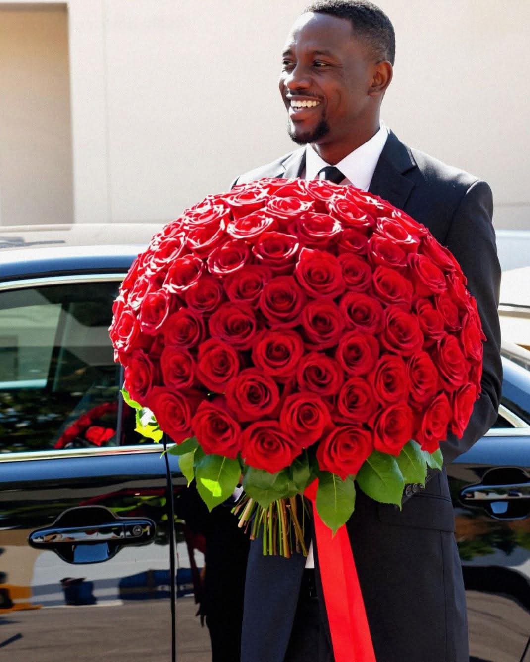 He grinned, holding out a bouquet of deep red roses. “Happy anniversary, babe.”