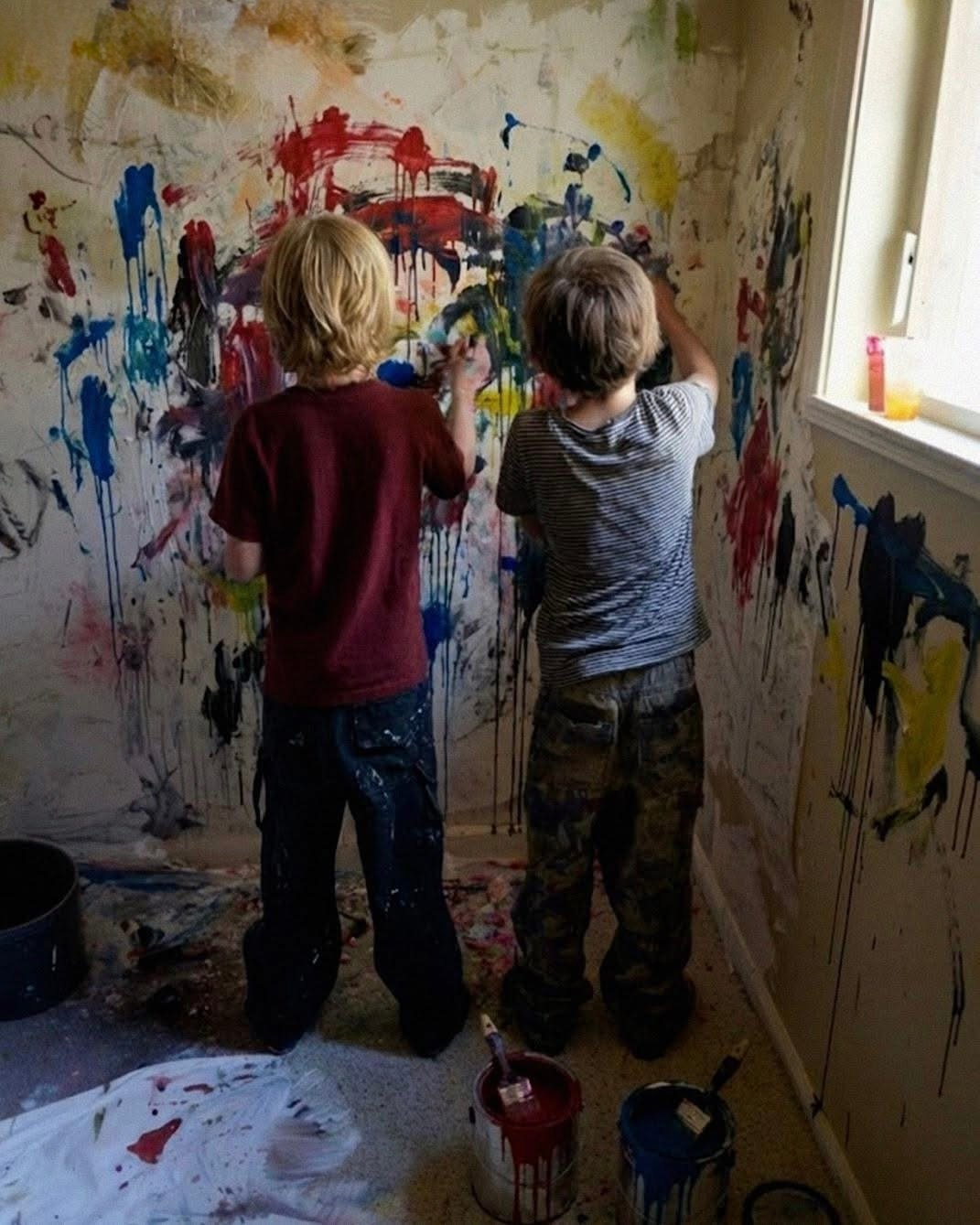 It looked like a Jackson Pollock canvas. There was paint everywhere… the walls, the ceiling, the bed, the drawers, the carpet. Noah and Jake stood in the middle of the chaos, also coated in paint, proud as parade floats.