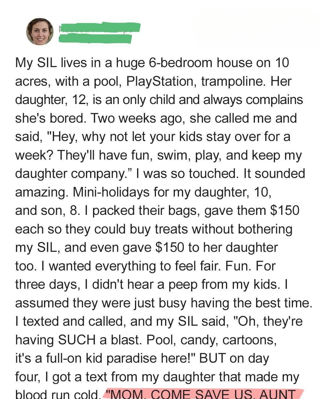 When my wealthy sister-in-law invited my kids to her massive estate for a week of fun—complete with a pool, games, and endless snacks—it felt like a dream opportunity. I sent them off with cash in their pockets and stars in their eyes, imagining laughter and summer joy. For three days, I heard nothing.