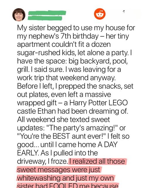 When my sister Sue asked to use my house for her son Ethan’s seventh birthday party, I agreed without hesitation, even though I’d be out of town for work. I stocked the kitchen with snacks, left out party supplies, and even bought Ethan a special gift: the LEGO set he’d been dreaming of. Sue’s grateful texts throughout the weekend made me feel like the best aunt ever.