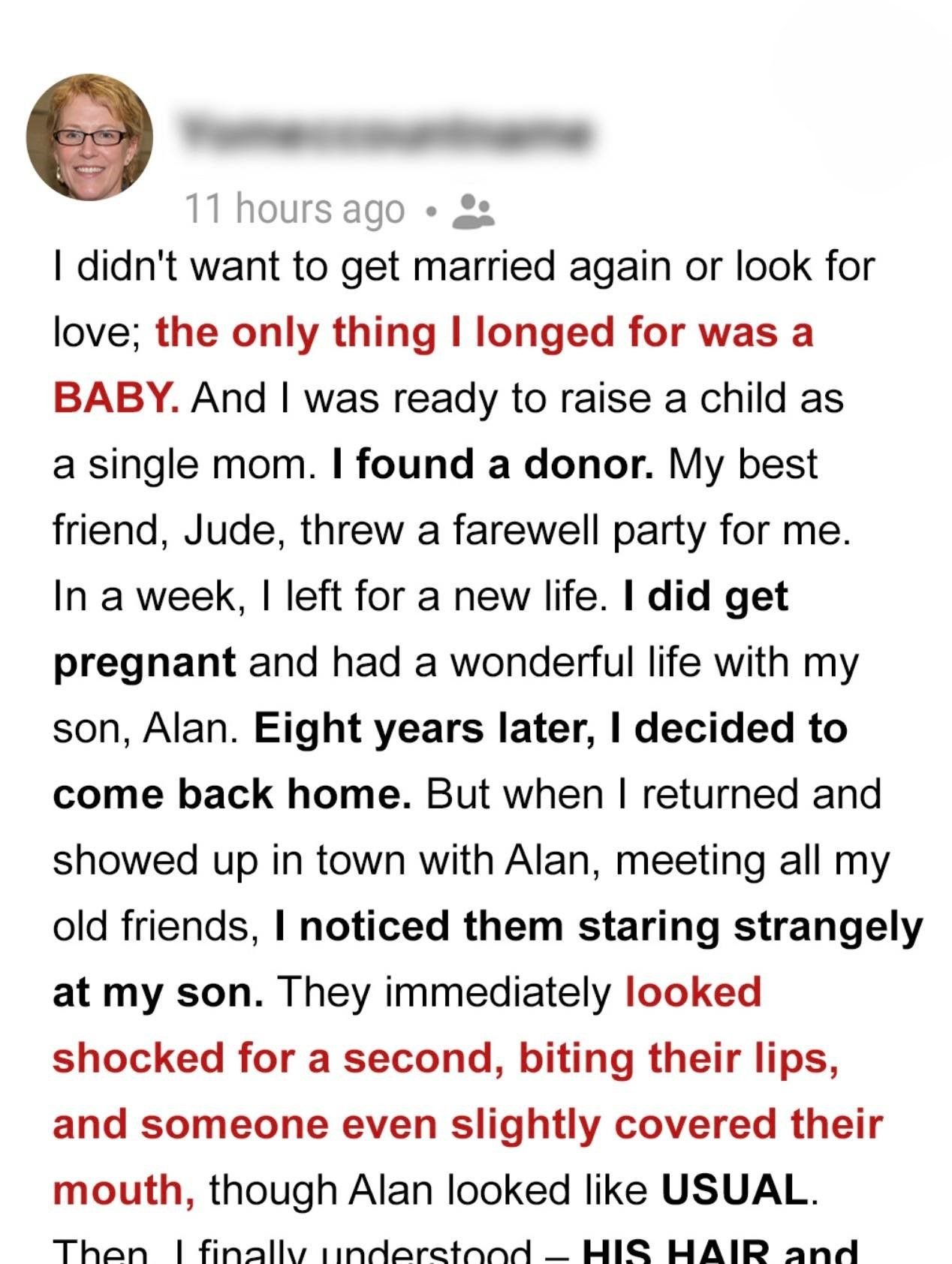 When my ex and I separated, I chose to become a single mother through sperm donation, so I was sure I knew where my son came from. But when we moved back to my hometown, the way my old friends stared at him made my stomach drop.
