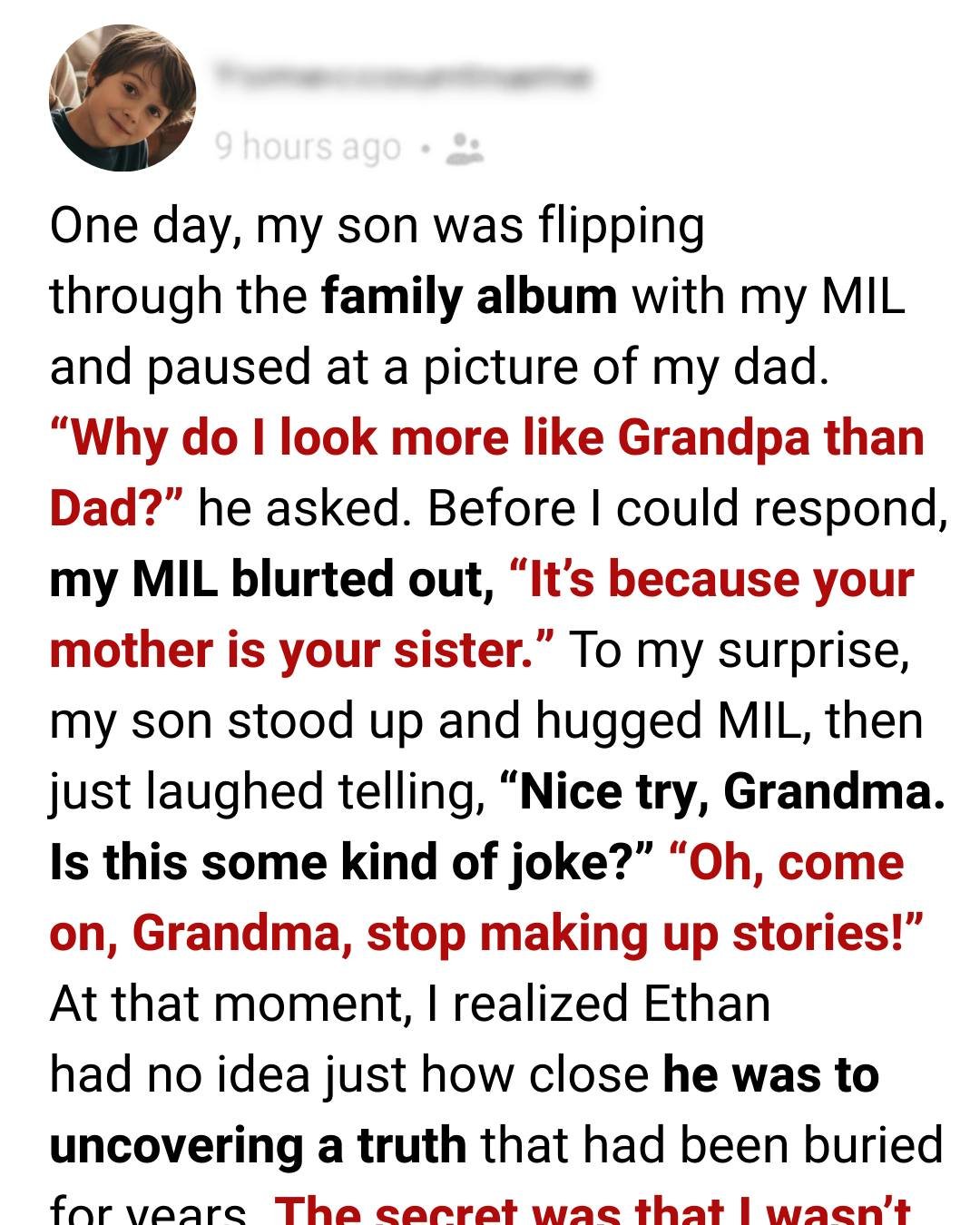 Before I could even open my mouth, my MIL blurted out the last thing I ever expected to hear aloud: “It’s because your mother is your sister.”
