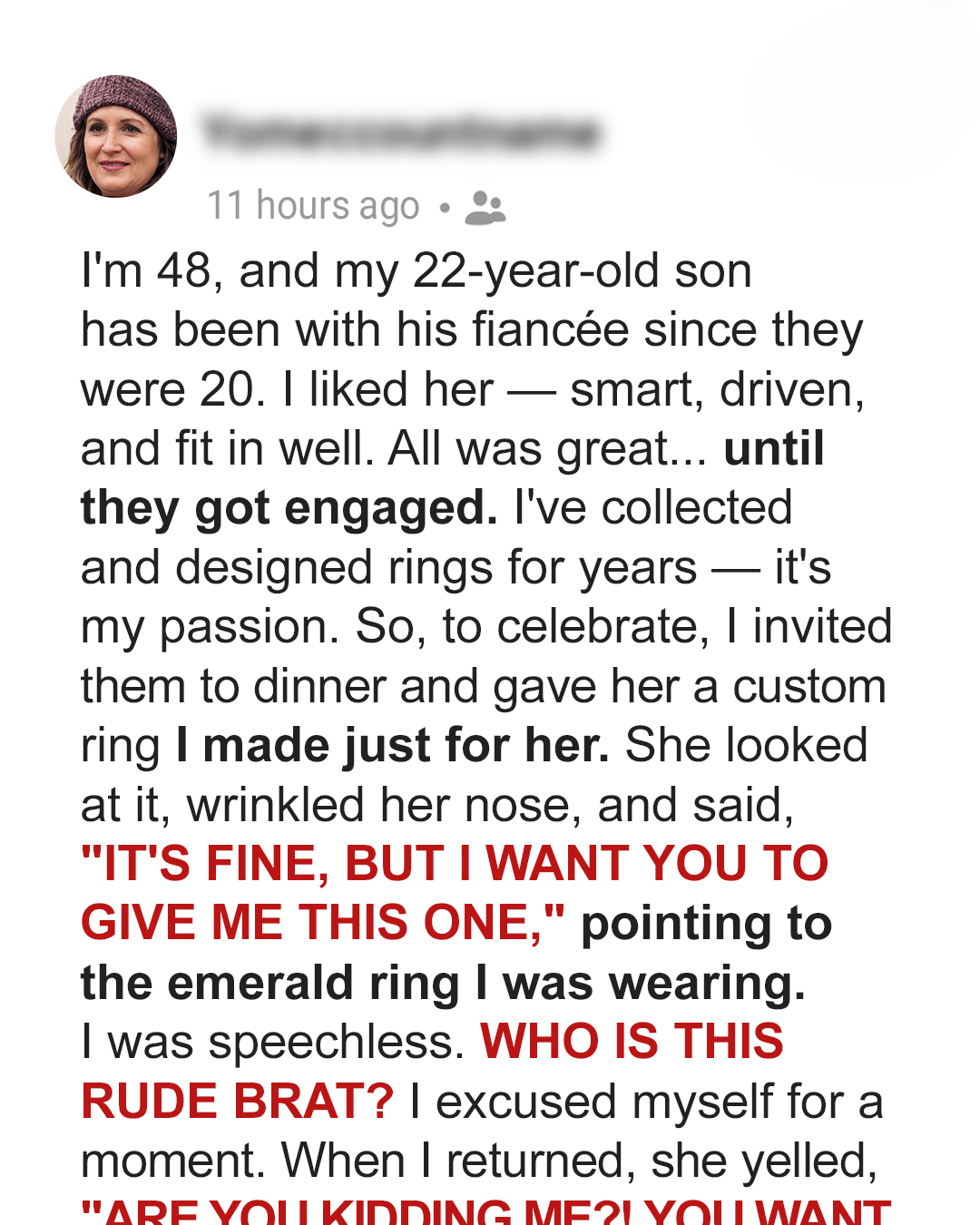 “In this family, special things are given with love not taken.” Whether she truly learned from it or just wanted to smooth things over, I don’t know. But my emerald ring stayed right where it belonged on my hand, a reminder that boundaries matter as much as love in a family.