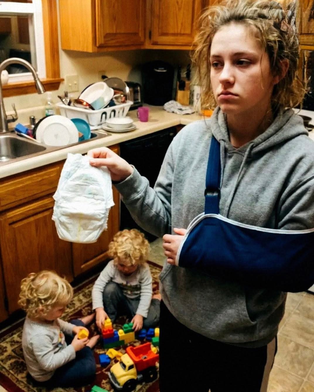She was sitting on the floor, pale and exhausted, with both twins climbing on her. One was tugging at her sling. The other was throwing Cheerios at her face like she was a carnival game.
