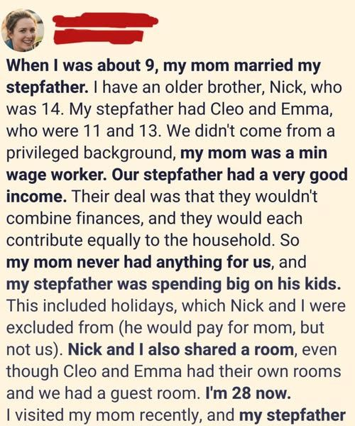 Growing up, I watched my stepdad book plane tickets and beach resorts for his daughters while my brother and I stayed home, pretending we didn’t care. We were part of the household, but never truly part of his plans. I convinced myself I had outgrown that chapter of my life until the afternoon he called to ask me for $25,000 to help his daughter buy her first house.