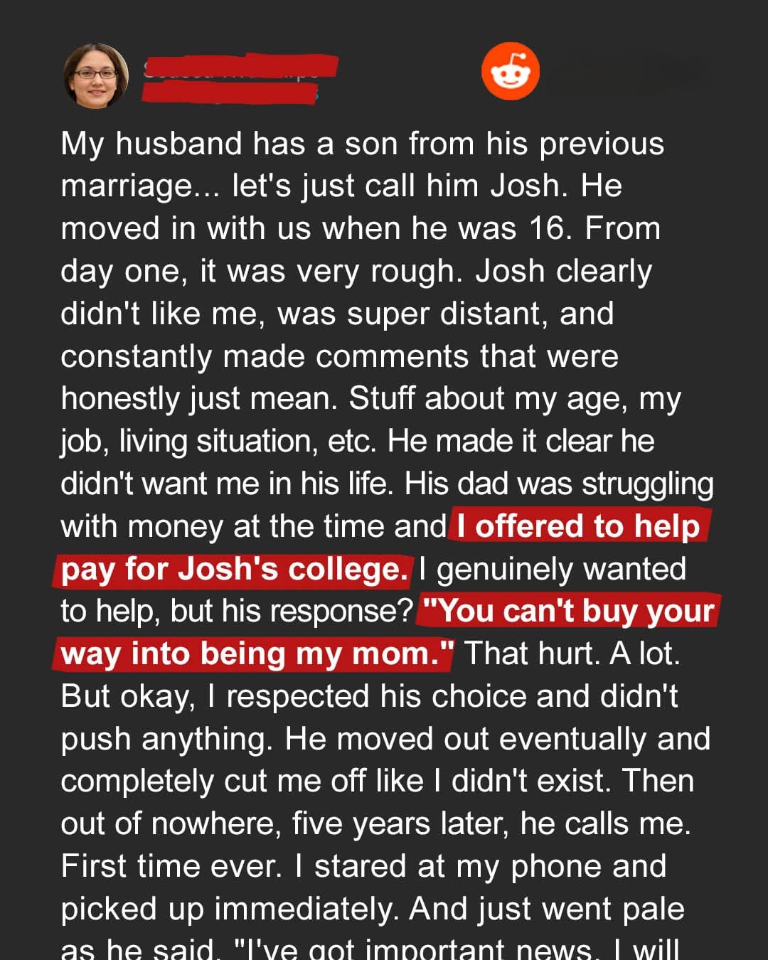 When her hostile stepson cruelly rejected her college fund offer, claiming, “You can’t buy your way into being my mom,” she let him go. Five years later, he calls with big news and a bold request that leaves her reeling.
