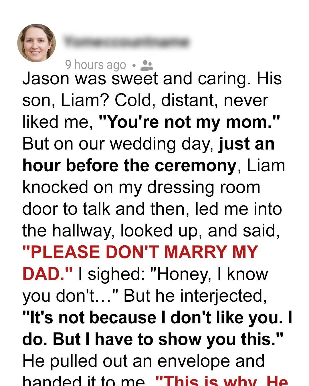 Moments before I was to walk down the aisle, Jason’s 13-year-old son, Liam, pulled me aside. “Please don’t marry my dad,” he whispered. Then, trembling, he handed me an envelope.