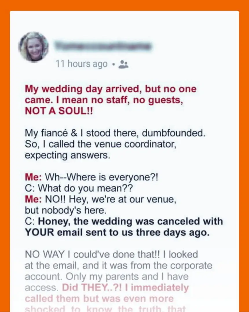 “The wedding was canceled. The directive came through your email address just three days ago.” My heart almost stopped beating. How could I have canceled my own wedding?