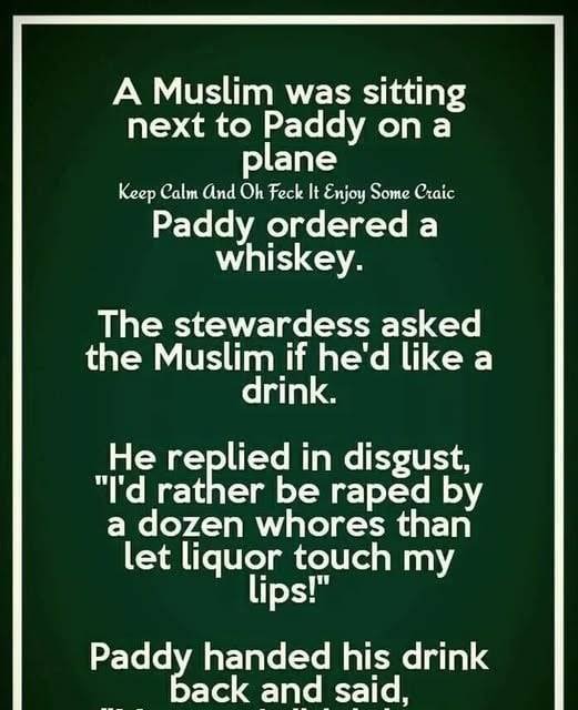 Paddy ordered a whiskey. The stewardess asked the Muslim if he’d like a drink.