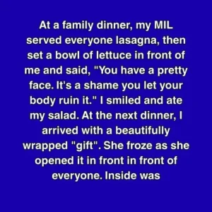 At a family dinner, my MIL served everyone lasagna, then set a bowl of lettuce in front of me and said, “You have a pretty face. It’s…