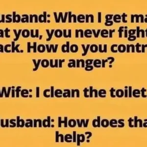 Husband: When I get mad at you, you never fight back. How do you control your anger? Wife: I clean the toilet. Husband: How does that help?…