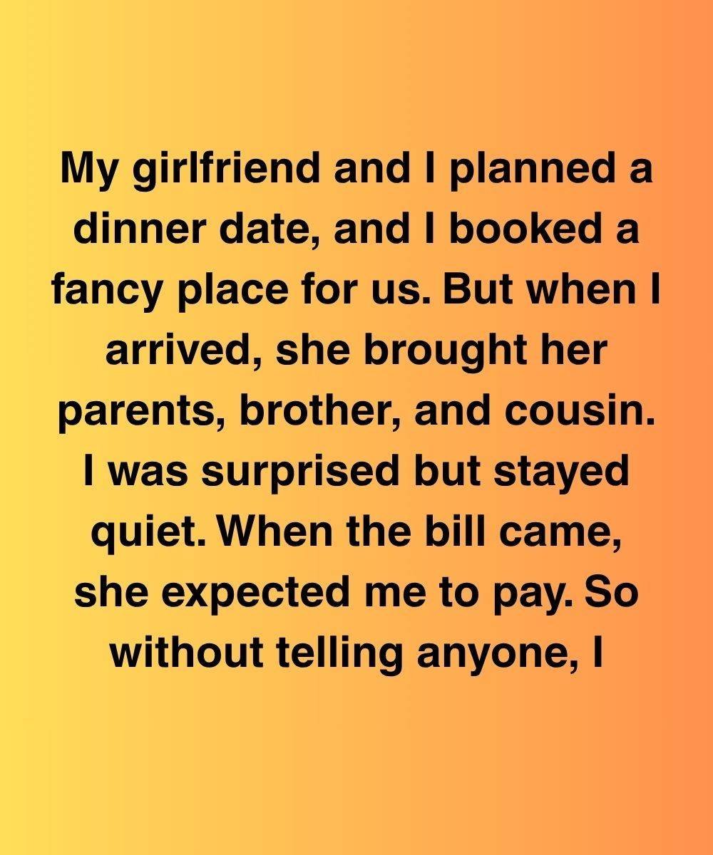 My girlfriend and I planned a dinner date, and I booked a fancy place for us. But when I arrived, she brought her parents, brother, and cousin. I was surprised but stayed quiet.